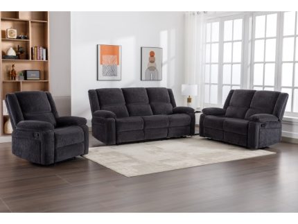 - Soft grey fabric upholstery, available in light or dark grey options.