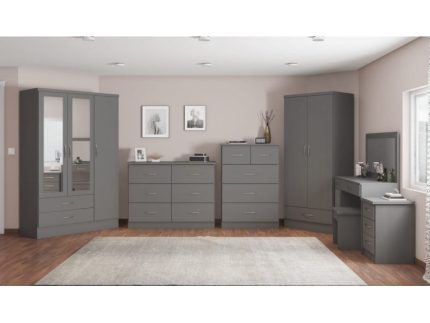 Nevada Full Grey Three Door Two Drawer Mirrored Wardrobe is a stylish grey wood effect finished wardrobe with metal handles & drawer runner that can add a modern look to any bedroom. Includes mirrors, shelving, storage drawers & hanging rail.