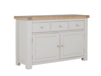 Doune Large Sideboard in Taupe, a versatile addition to any room. This large sideboard features a stylish painted finish with an elegant oak veneer top. It offers practical storage with three drawers and two doors, plus internal shelving for organised space. The sleek metal handles and balanced design make it both functional and fashionable.