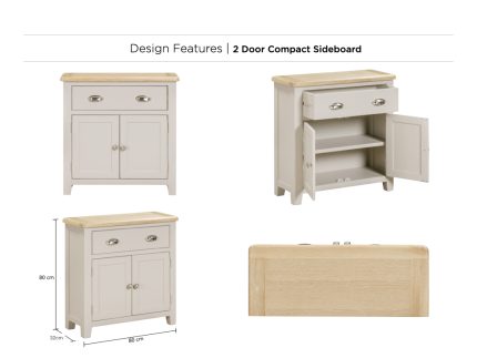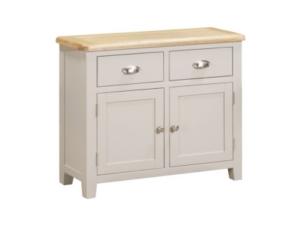 Doune Small Sideboard in Taupe, a versatile addition to any room. This compact sideboard features a stylish painted finish with an elegant oak veneer top. It offers practical storage with two drawers and two doors, plus internal shelving for organised space. The sleek metal handles and balanced design make it both functional and fashionable.