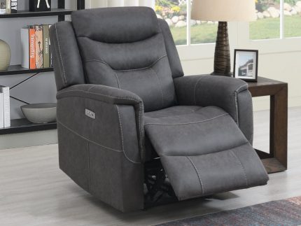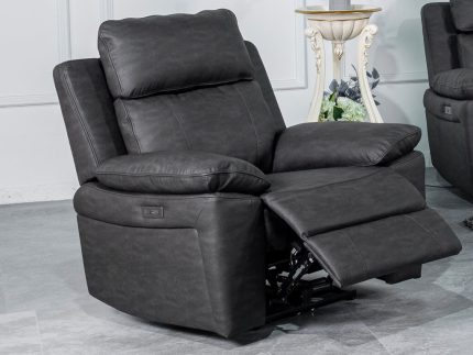 The electric Huntington Armchair in dark grey offers personalized relaxation with a smooth reclining mechanism and power headrest, easily adjustable