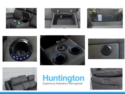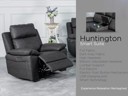 Elevate your home with the Huntington 3+2 Electric Sofa Suite in an elegant dark grey, where design meets technological innovation.