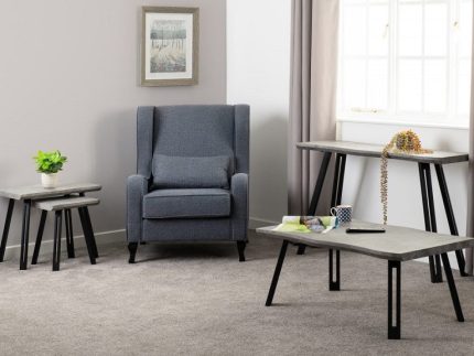 Quebec Coffee Table is made from wood effect MDF board with a metal frame and has an unusual wave edge.