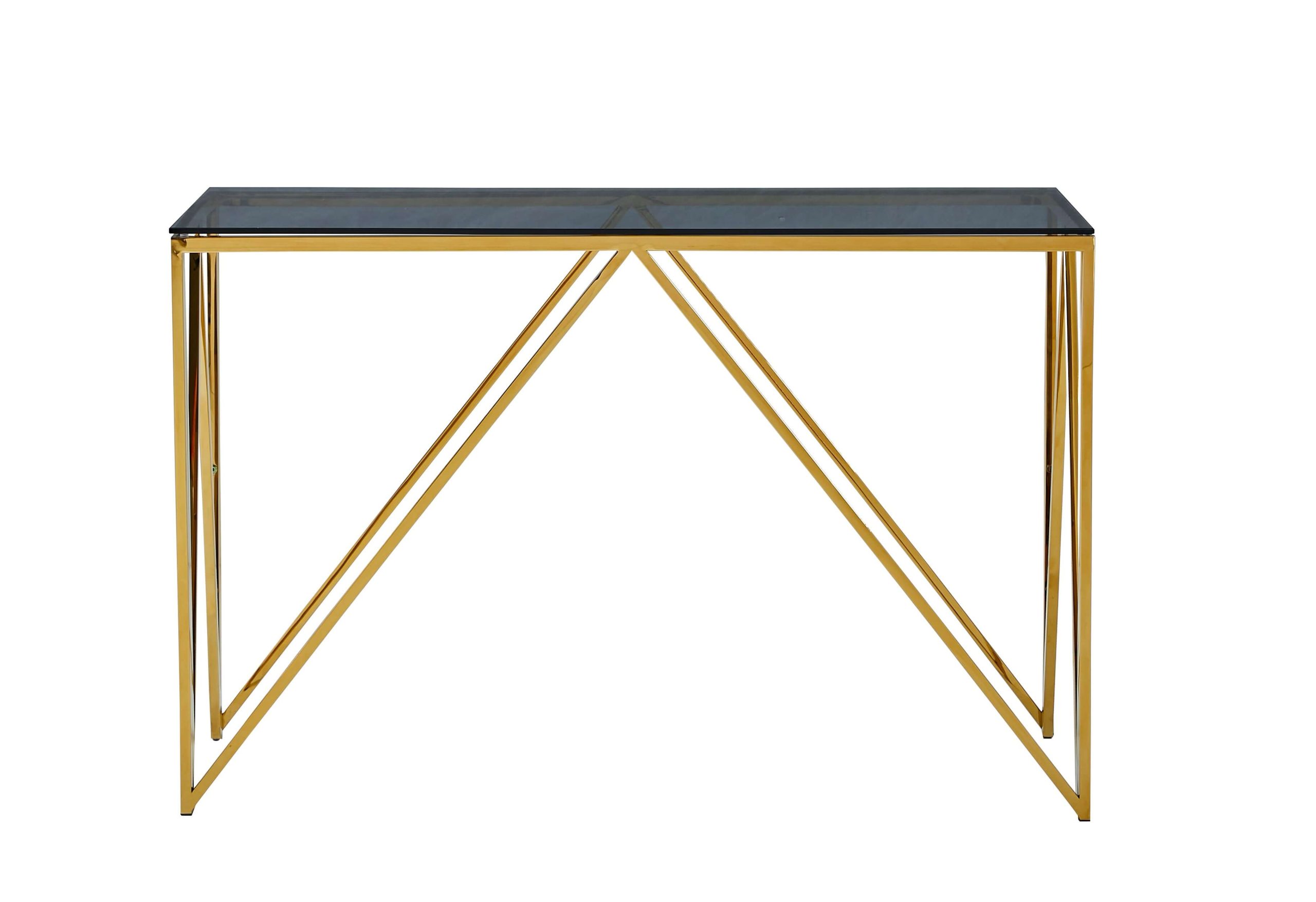 Allure Gold Console Table boasts an exquisite blend of classic gold and stylish blue-grey smoked glass. Add a touch of class to your space with this refined piece.