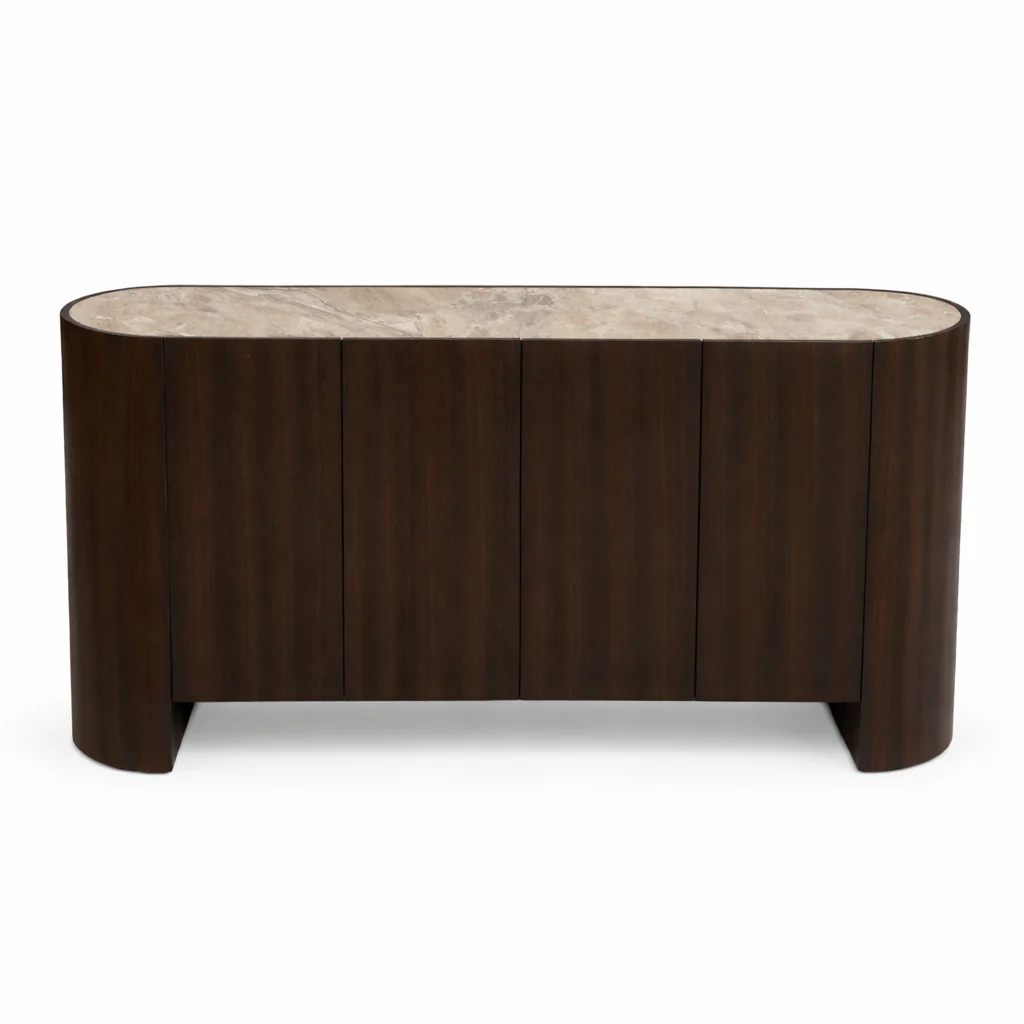 The Atlanta 4 Door Sideboard features Dark Oak smoked veneer on MDF with a durable sintered stone top. Four doors provide generous concealed storage, combining modern style with practical functionality.