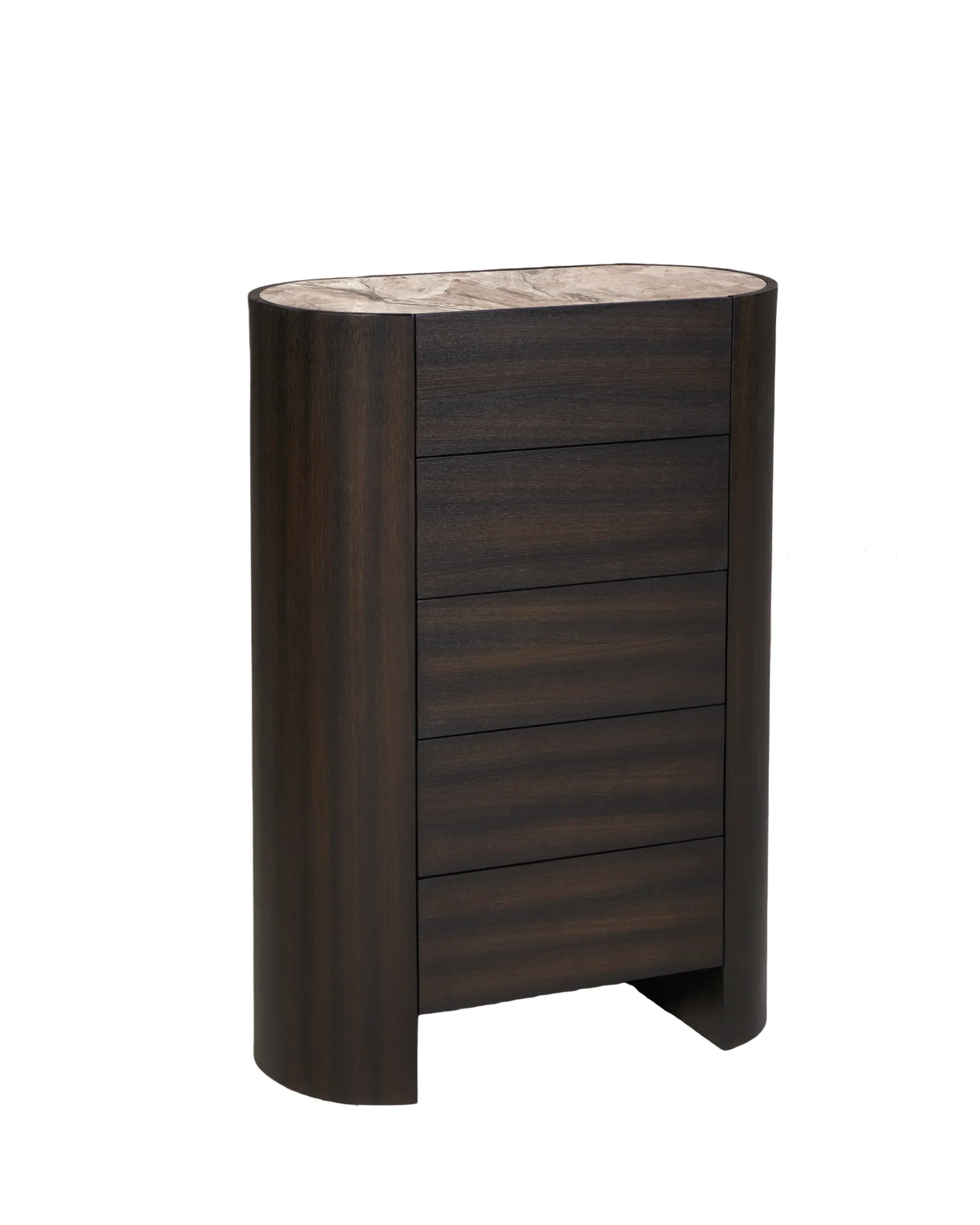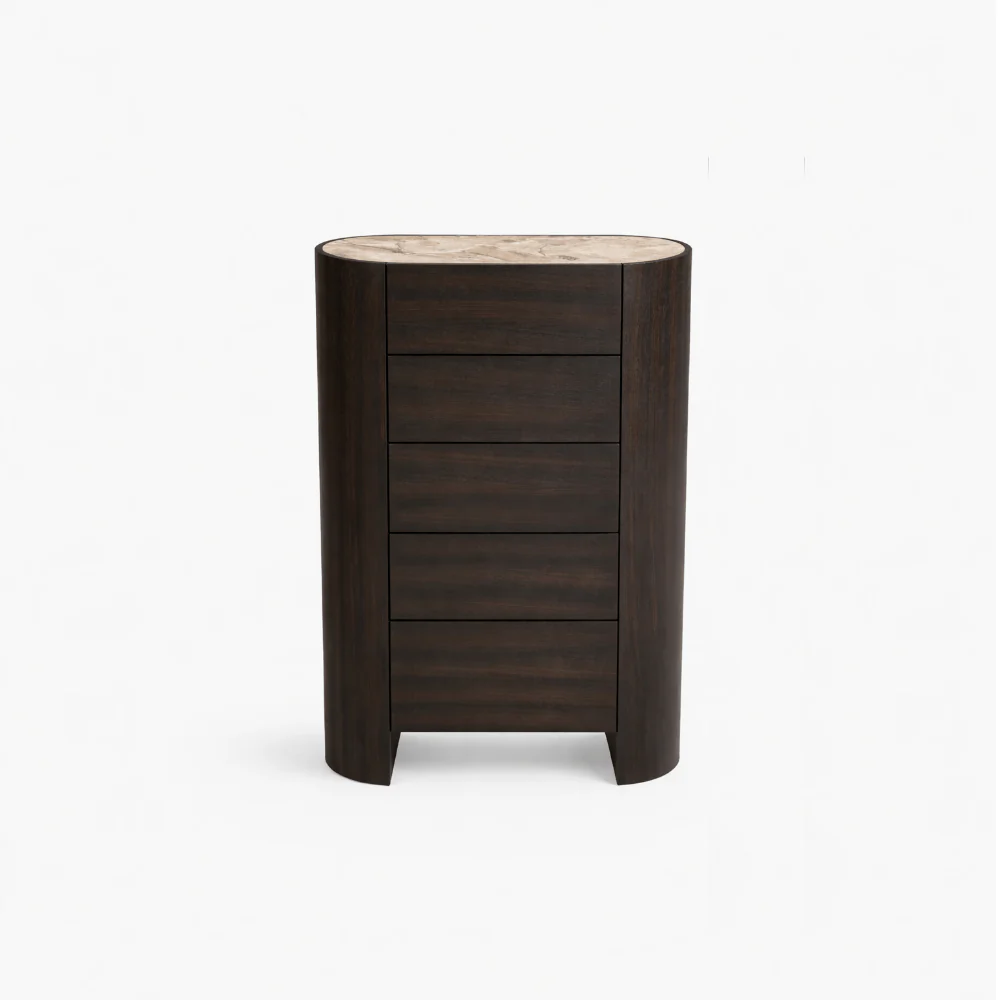 The Atlanta 5 Drawer Tallboy features Dark Oak smoked veneer on MDF with a sintered stone top. Five drawers offer generous storage while the modern, rounded silhouette keeps your space stylish and organized.