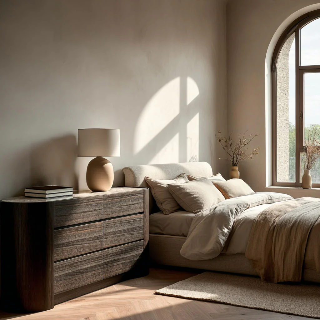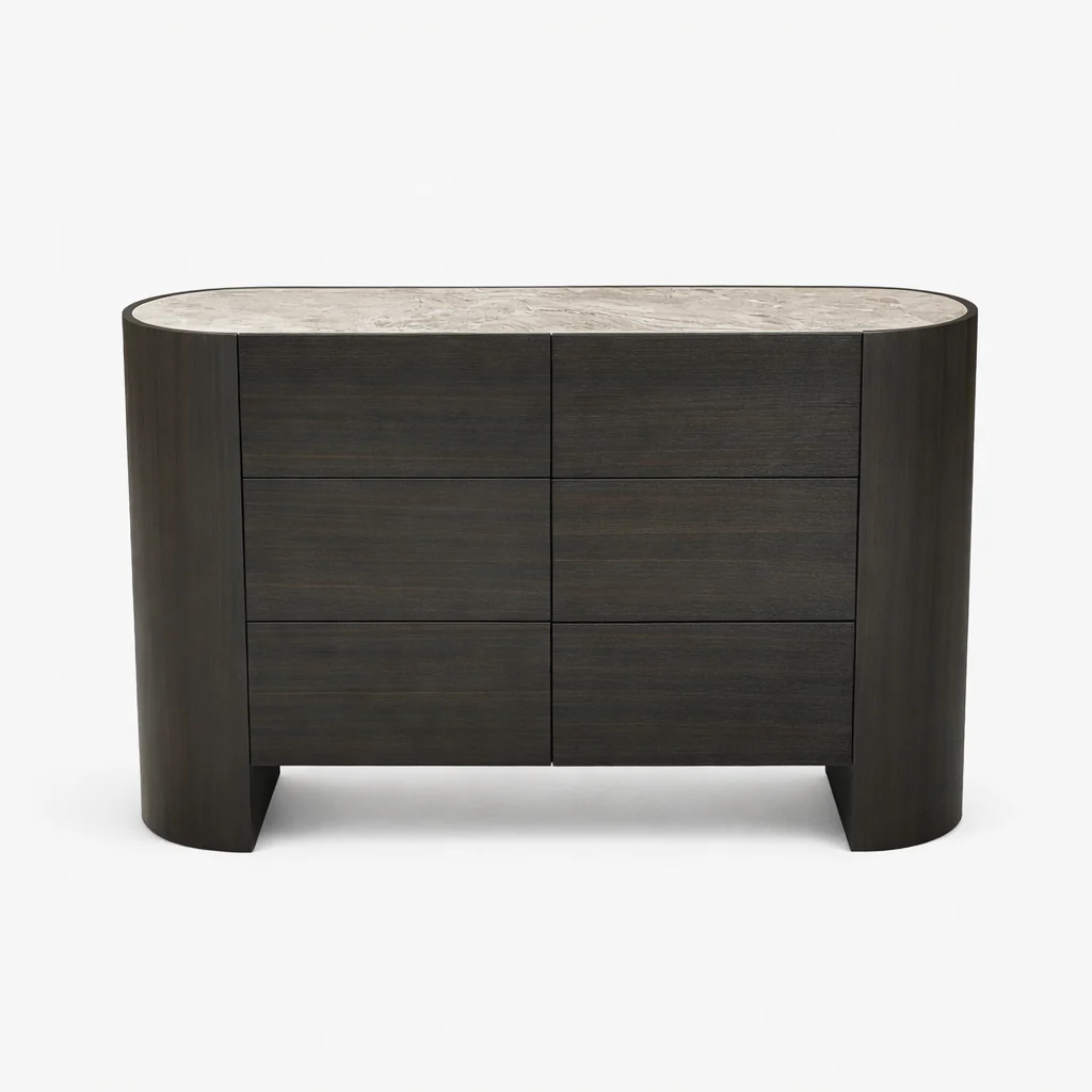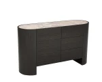 The Atlanta 6 Drawer Chest features Dark Oak smoked veneer on MDF with a sintered stone top. Six spacious drawers provide ample storage, while the modern, rounded design adds a refined look to any bedroom or living space.