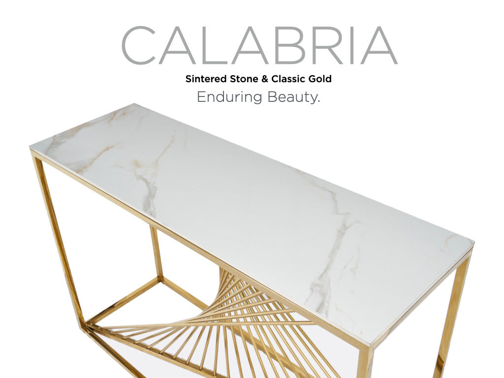 Constructed from 12 mm thick sintered stone and finished in gold, the Calabria Console Table arrives already fully assembled. Its sleek contemporary lines and luxurious pairing of materials make it a stunning addition to your home.
