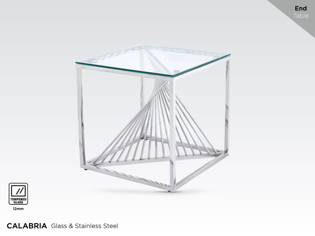 Calabria End Table features 12 mm thick Glass and Stainless Steel construction and arrives fully assembled. The design is modern yet timeless, adding a sophisticated touch to your living space.
