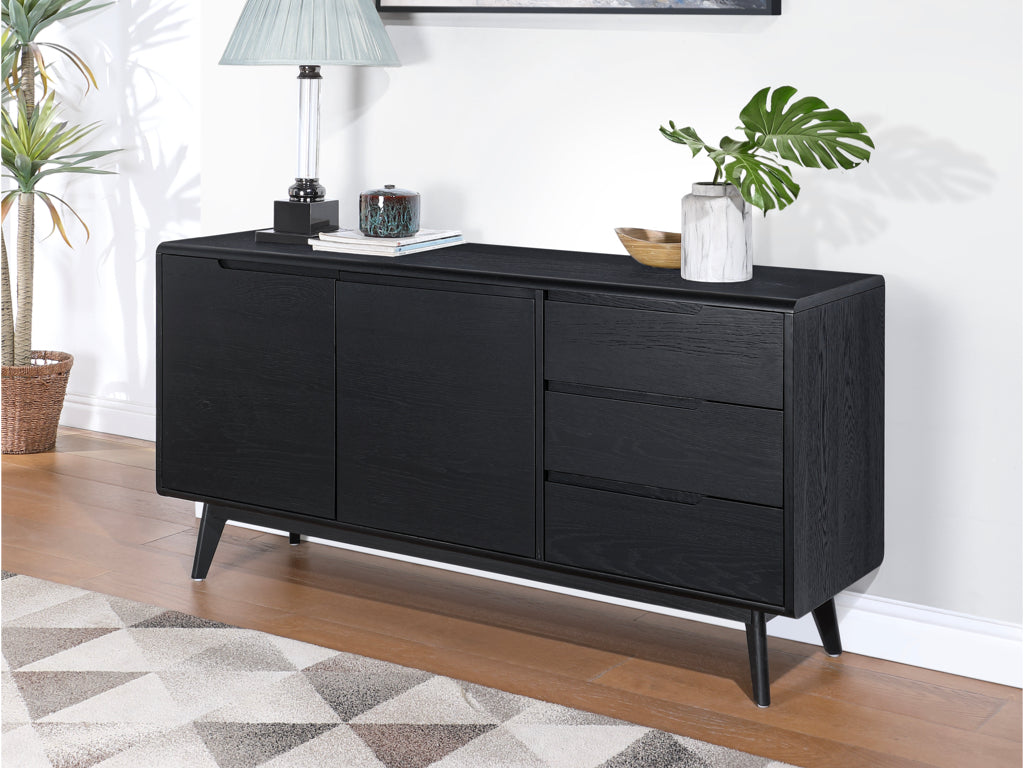 The Carrington Triple Sideboard in Black is a perfect blend of style, storage, and functionality, making it a standout addition to any dining or living room. Featuring a sleek black finish, this sideboard brings contemporary elegance to your home while providing practical storage solutions. Designed with two spacious doors and three central drawers, this sideboard offers ample space to keep your dining essentials, tableware, or household items neatly organized.