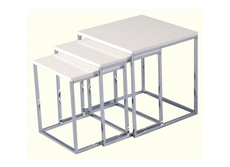 The Charisma White Gloss Nest Of Three Tables is made from MDF board, white gloss effect panels and polished metal legs.