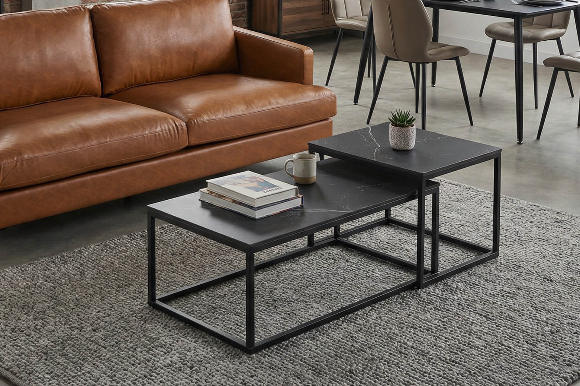 Cody Coffee Table Set in Black combines modern style with high-performance materials. Featuring a sleek powder-coated metal frame and durable sintered stone tops, this set is heat resistant, waterproof, stainproof, and antibacterial. Easy to clean and built to last, it’s the perfect blend of practicality and contemporary design for any living space.