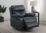 Includes a static three and two seat sofas, a manual reclining armchair and a manual reclining rocker/swivel armchair, all in a ‘steel blue’ easily maintained fabric upholstery with extra padded headrests & arms.