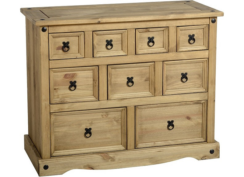 Corona Pine 4+3+2 Chest-the Mexican styled Corona Pine Collections have prominent black metal studs, metal drawer runners & black metal hinges, which add to their design style, all elements of these collections have distressed pine finishes and are exceptional value for money.