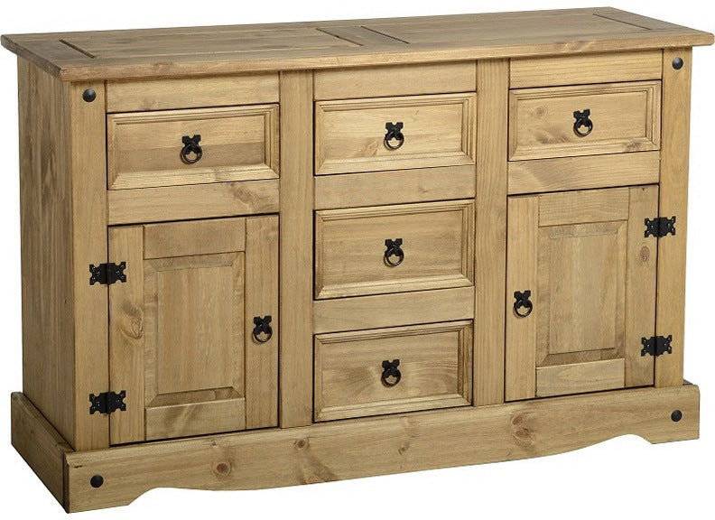 Corona Pine Two door Five Drawer Sideboard-the Mexican styled Corona Pine Collections have prominent black metal studs, metal drawer runners & black metal hinges, which add to their design style, all elements of these collections have distressed waxed pine finishes and are exceptional value for money. Every conceivable dining, bedroom or occasional item is available.