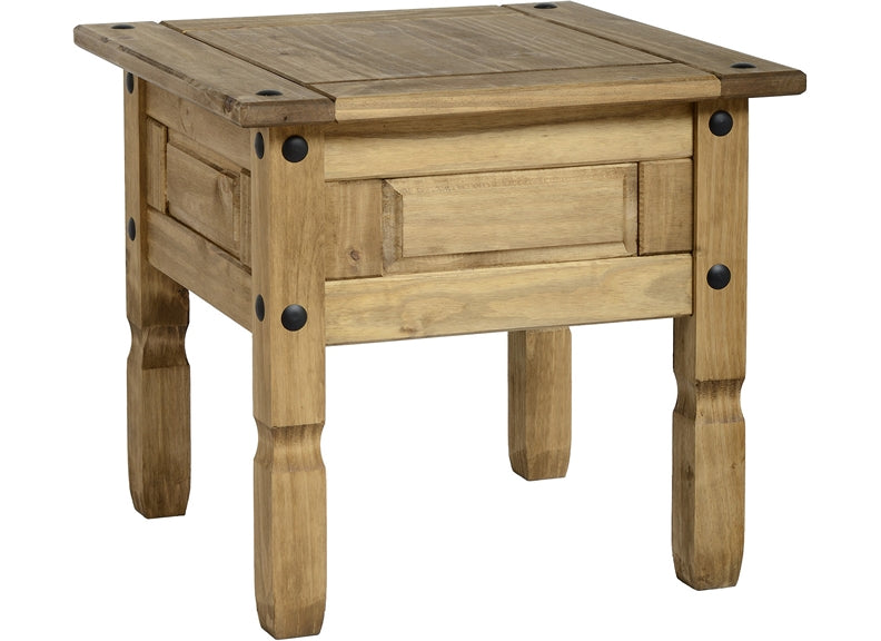 Corona Pine Lamp Table-the Mexican styled Corona Pine Collections have prominent black metal studs, metal drawer runners & black metal hinges, which add to their design style, all elements of these collections have distressed pine finishes and are exceptional value for money. Every conceivable dining, bedroom or occasional item is available.
