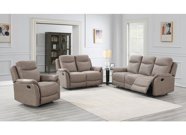 SILVANO GREY FABRIC RECLINING SOFA COLLECTION - with dark grey soft fabric upholstery, with pleated backs, extra soft headrests and manual reclining action.