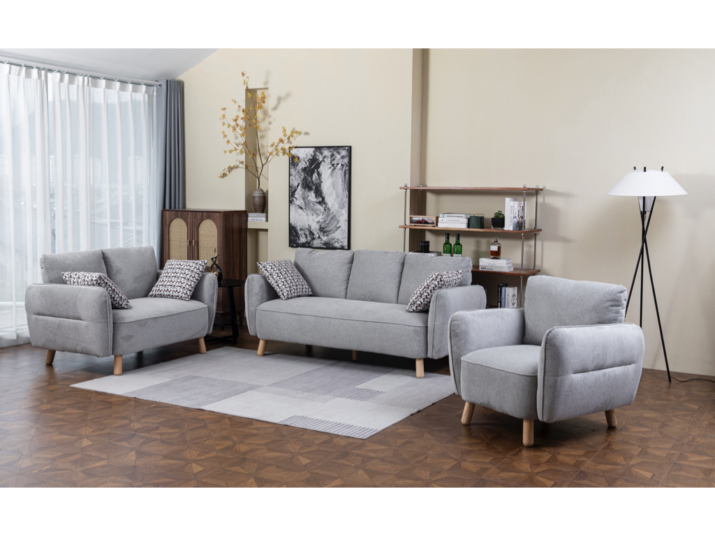 Georgia Fixed Suite, a stunning 3, 2, 1 luxury fabric suite in a sophisticated Dark Grey and Light Grey Fabric colour. This stylish set offers a timeless design with a cozy touch, perfect for any modern home. The 3-seater and 2-seater come with matching scatter cushions, adding a plush, decorative accent to your living space. Crafted with soft, durable fabric, a pocket sprung seat and matches with solid wood legs in oak finish, the Georgia suite provides the ultimate comfort for you and your family. Create a serene haven in your home, where you can relax and unwind in style and luxury, perfect for any occasion or moment of rest.