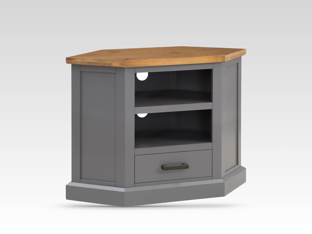 This piece is expertly crafted from high-quality solid pine, ensuring both durability and a rich aesthetic presence. Featuring a hand-painted charcoal grey body, it provides a sophisticated contrast to the warm, rustic pine top. Designed specifically to fit snugly into corner spaces, this TV unit optimizes your living area without sacrificing style or functionality.