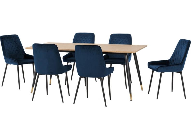 The Hamilton Table is available here in 1.8 m size with six Avery Velvet Dining Chairs in a sapphire blue, emerald green or black velvet colours, these chairs also have black metal supporting legs.
