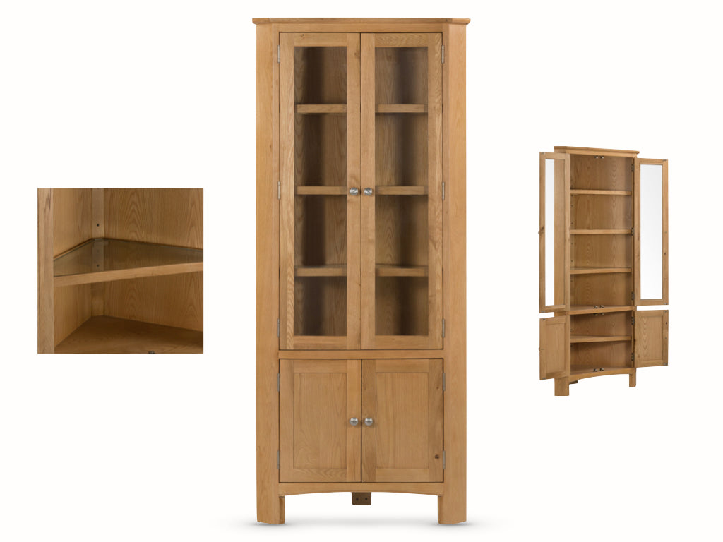 The Kilkenny Corner Display Unit maximizes space and adds sophistication to any room with its elegant design. Made with solid oak and veneers, it features glass doors to showcase your favorite items and solid oak doors for additional storage. A perfect combination of form and function.