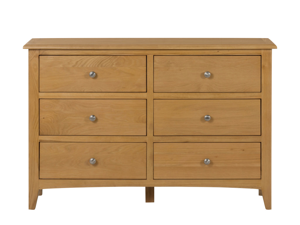 The Kilkenny Oak 6 Drawer Chest combines elegance and storage with solid oak construction and six spacious drawers fitted with chrome handles. Its timeless appeal and refined design make it a perfect addition to any bedroom.