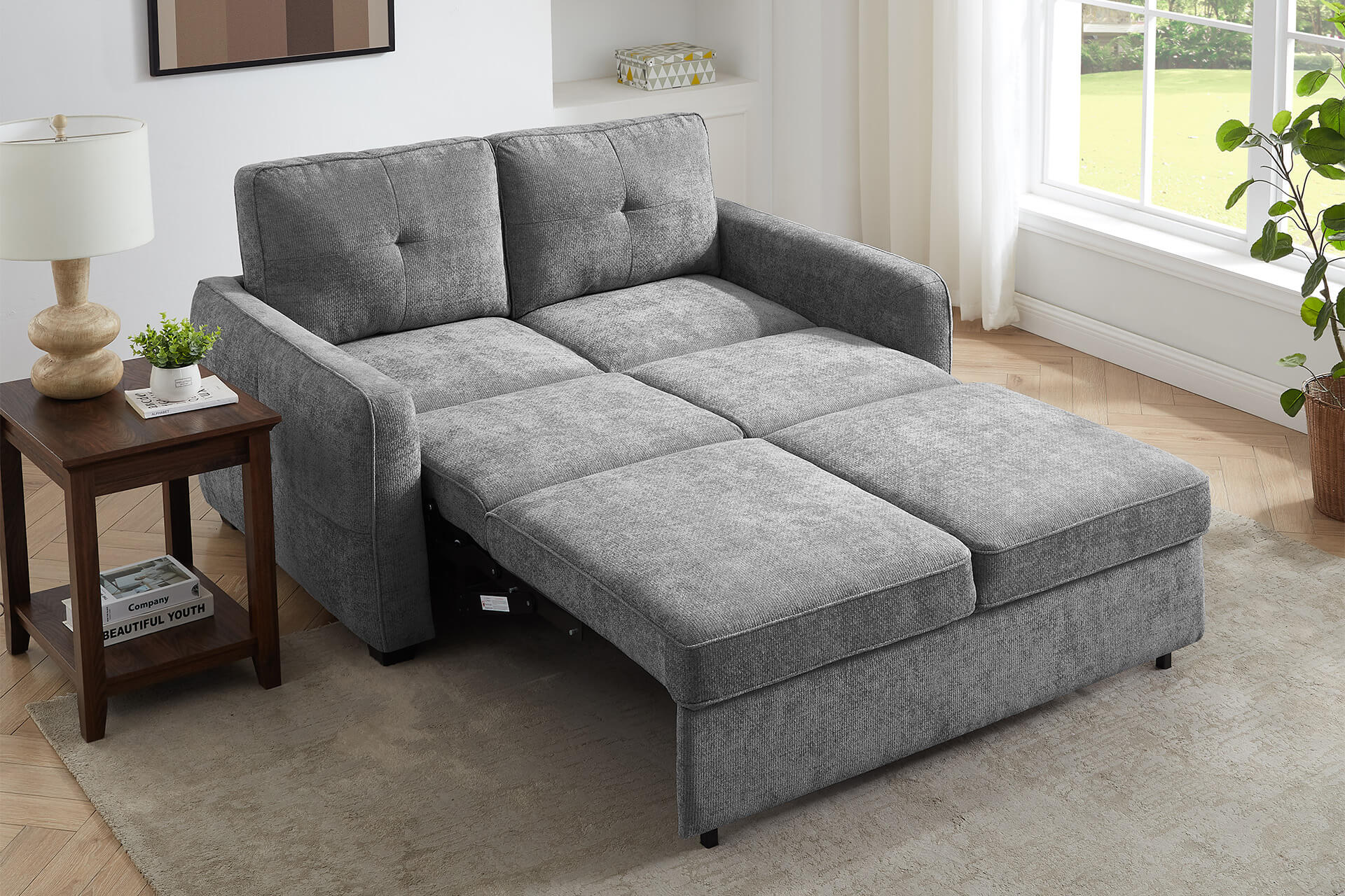 Koda Sofa Bed in Grey features a pocket-sprung seat with an EasyGlide pull-forward sleep system for effortless conversion. Upholstered in soft chenille fabric, it is detailed with pin tuck styling on the arms and back cushions, while loose back cushions add comfort and relaxed appeal for everyday living.Koda Sofa Bed – Grey (Nett) _x000D_