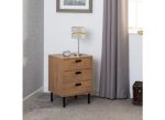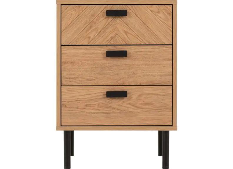 LEON OAK THREE DRAWER BEDSIDE with metal drawer runners & metal handles.