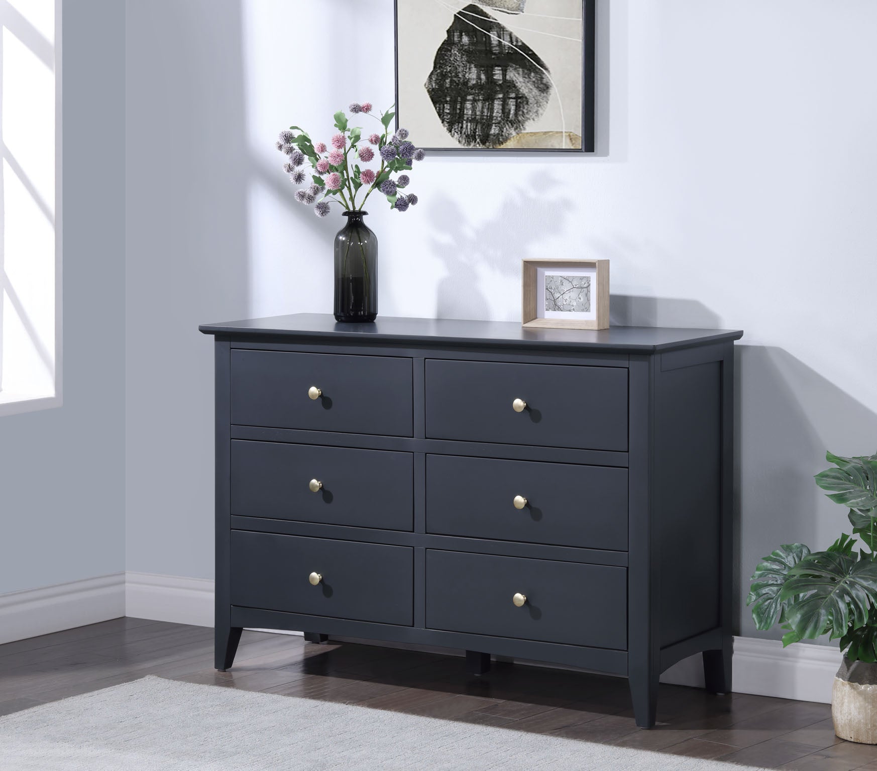 The Luciana 6 Drawer Chest in Off Black combines contemporary sophistication with timeless elegance, making it a perfect addition to any bedroom. This chest features a sleek off-black finish that adds a modern touch to your décor while providing ample storage space with six spacious drawers.