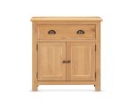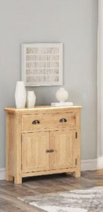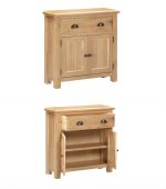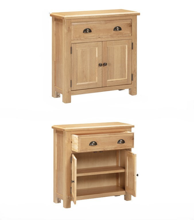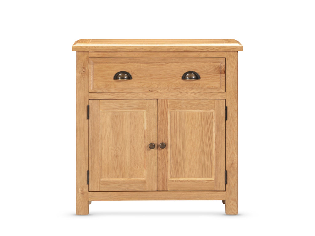 Designed for practicality, the Lugano Oak Compact Sideboard offers ample storage with one drawer and two spacious cabinets, perfect for organizing dining essentials, tableware, and other household items. The clean lines, rounded corners, and brass cup handles add a touch of traditional elegance, while the sturdy construction ensures long-lasting durability.