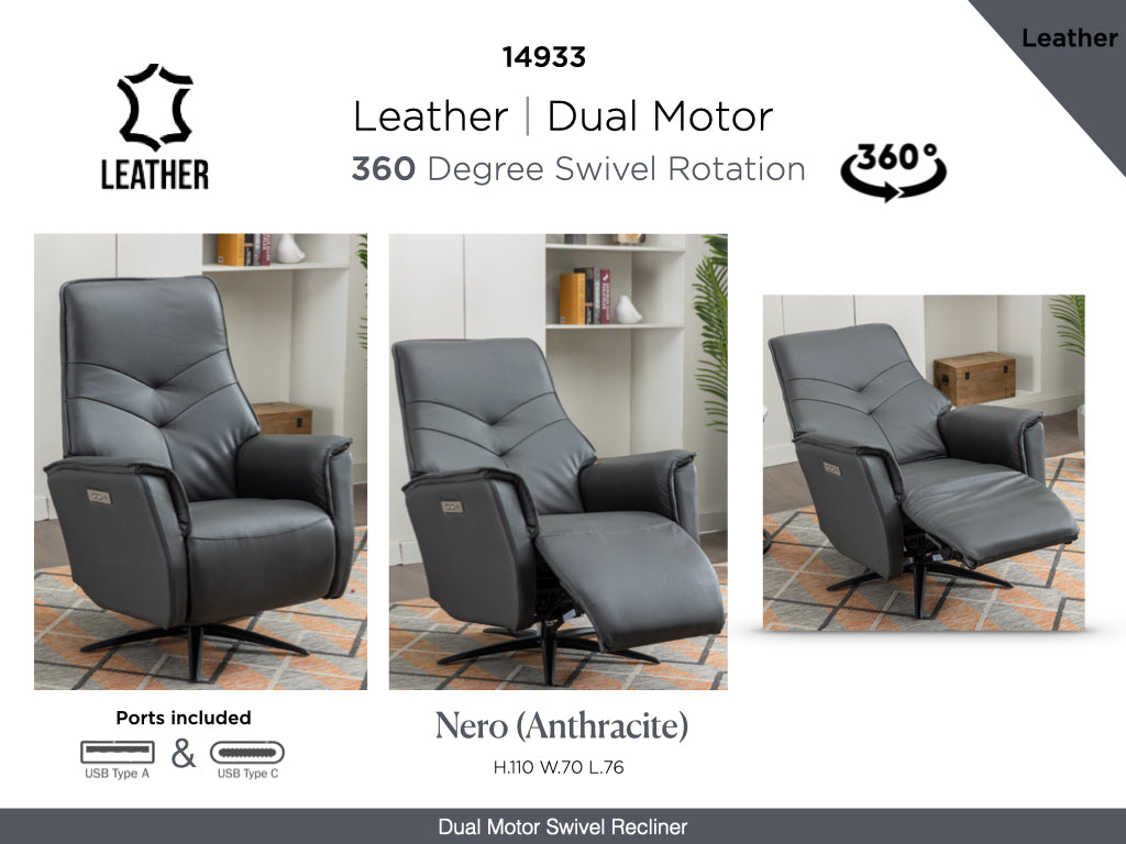 Introducing Nero Full Leather Swivel Lounge Chairs with Dual Motor: the epitome of relaxation and style. Enjoy independent controls for both the backrest and footrest for complete control over your seating arrangement. Crafted with meticulous attention to detail, these lounge chairs deliver luxury and sophistication with their two on-trend leather colours, Anthracite and Moon,  with 360 degree rotation.