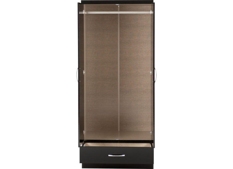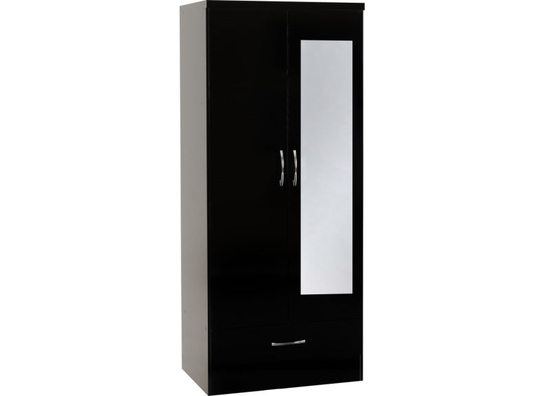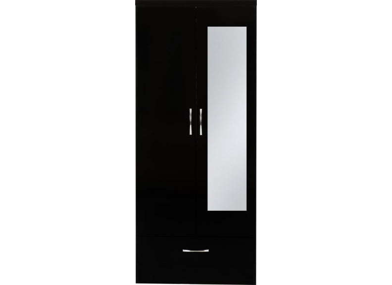 Nevada Black Gloss Two Door One Drawer Mirrored Wardrobe is a stylish gloss bedroom piece made from wood veneers with metal handles & drawer runners at a value for money price.