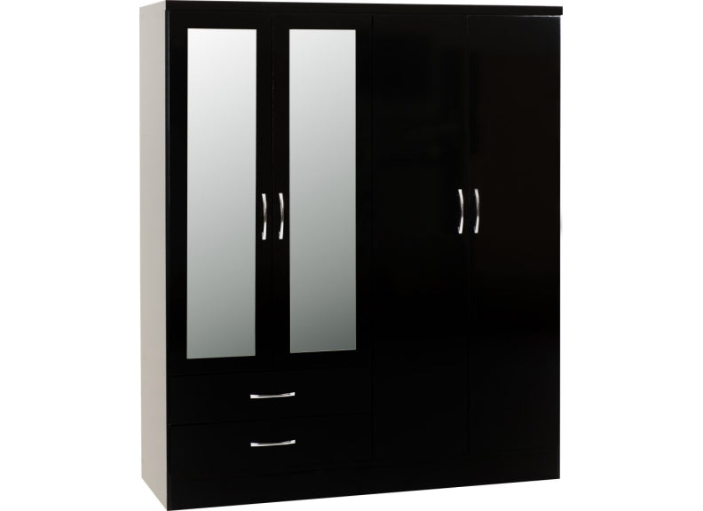 Nevada Black Gloss 4 Door 2 Drawer Mirrored Wardrobe