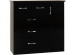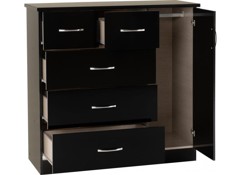 Nevada Black Gloss Five Drawer Low Wardrobe is a stylish gloss lacquered wood effect wardrobe with metal handles & drawer runners that will add to any bedroom’s decor. Includes five storage drawers and a small robe with hanging rail.