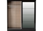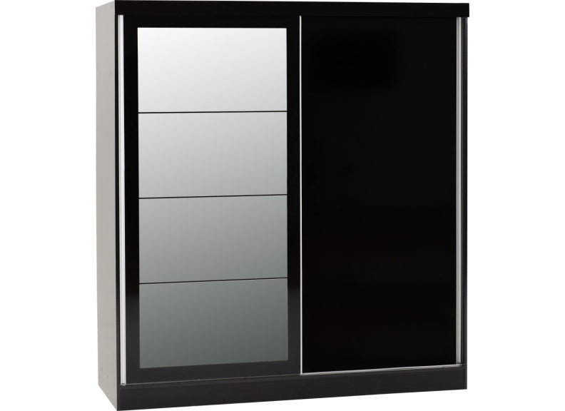Nevada Two Sliding Door Wardrobe crafted from wood board, composite wood & plastics with one mirrored door. Part of the Nevada Black Gloss Bedroom Collection.