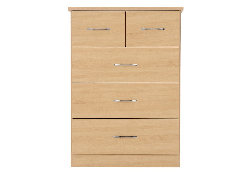 Nevada Oak 3+2 Chest is a stylish bedroom item with a light sonoma oak effect veneer with metal handles & drawer runners that can add a modern look to any bedroom.