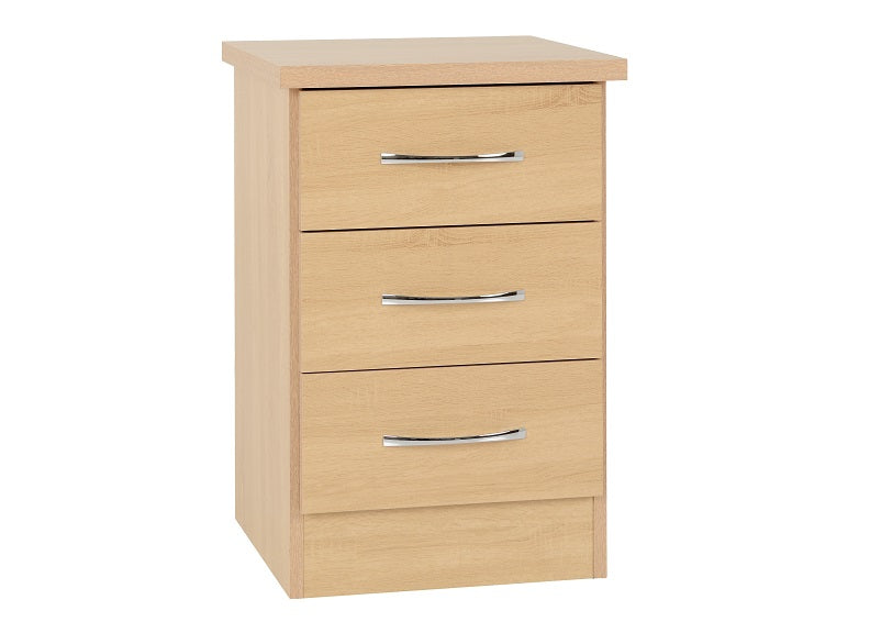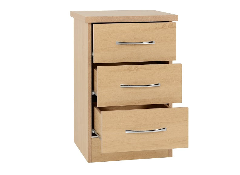 Nevada Oak Three Drawer Bedside is a stylish bedroom item with a light sonoma oak effect veneer with metal handles & drawer runners that can add a modern look to any bedroom.