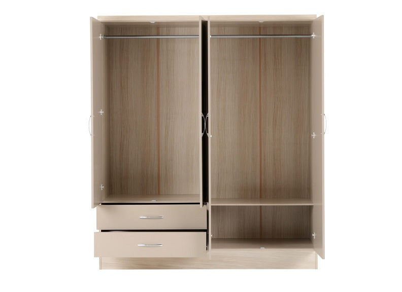 Nevada Oyster Four Door Two Drawer Mirrored Wardrobe is a stylish two tone coloured wood effect finished wardrobe with metal handles & drawer runner that can add a modern look to any bedroom.