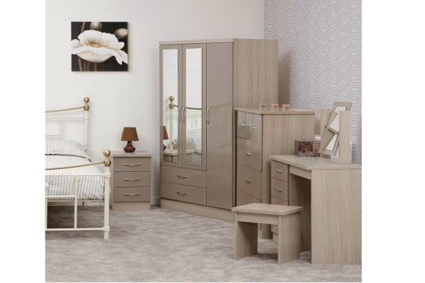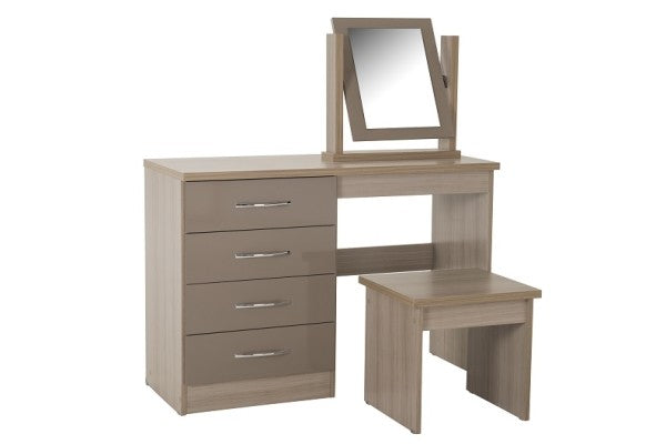 The Nevada Oyster Dressing Table Set is a stylish oyster coloured gloss bedroom item with metal handles that can add a modern look to any bedroom. Included are a stool, mirror & four drawer dressing table.