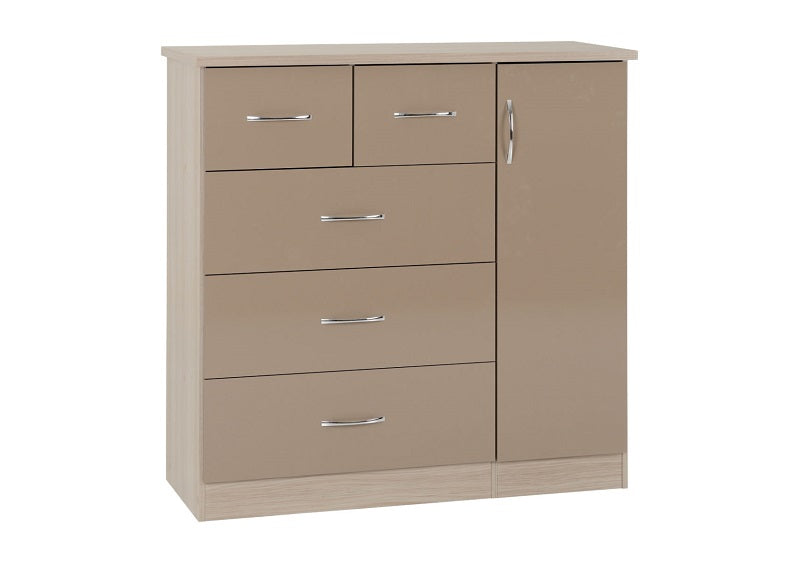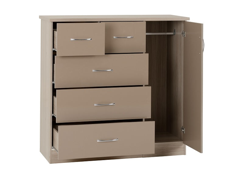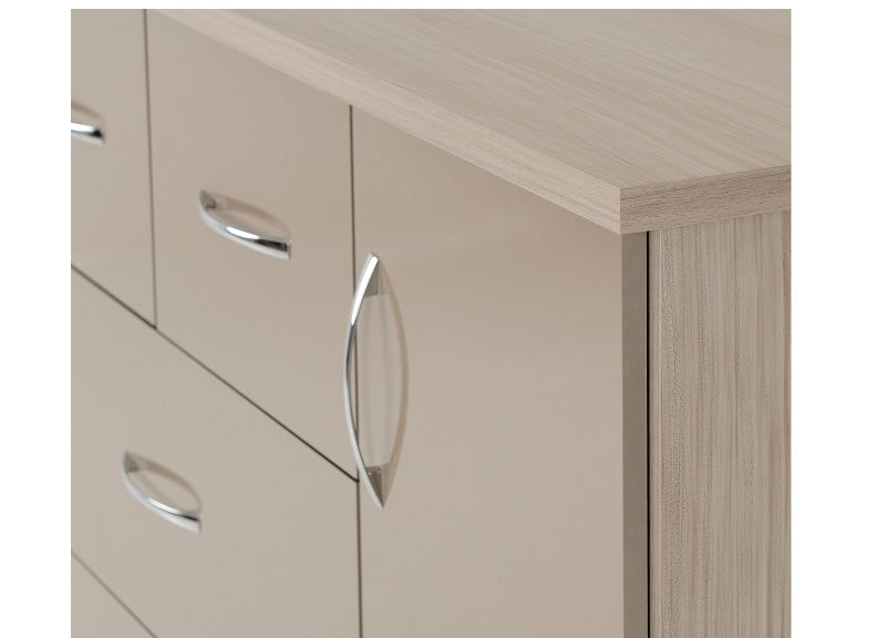 Nevada Oyster Five Drawer Low Wardrobe is a stylish two tone coloured wood effect finished wardrobe with metal handles & drawer runners that can add a modern look to any bedroom.