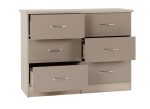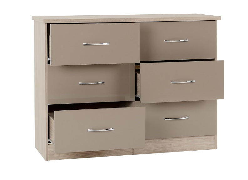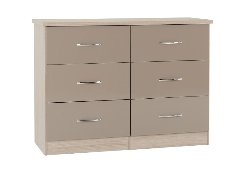 Nevada Oyster Six Drawer Wide Chest is a stylish gloss chest with a coloured wood effect veneer with metal handles that can add a modern look to any bedroom.
