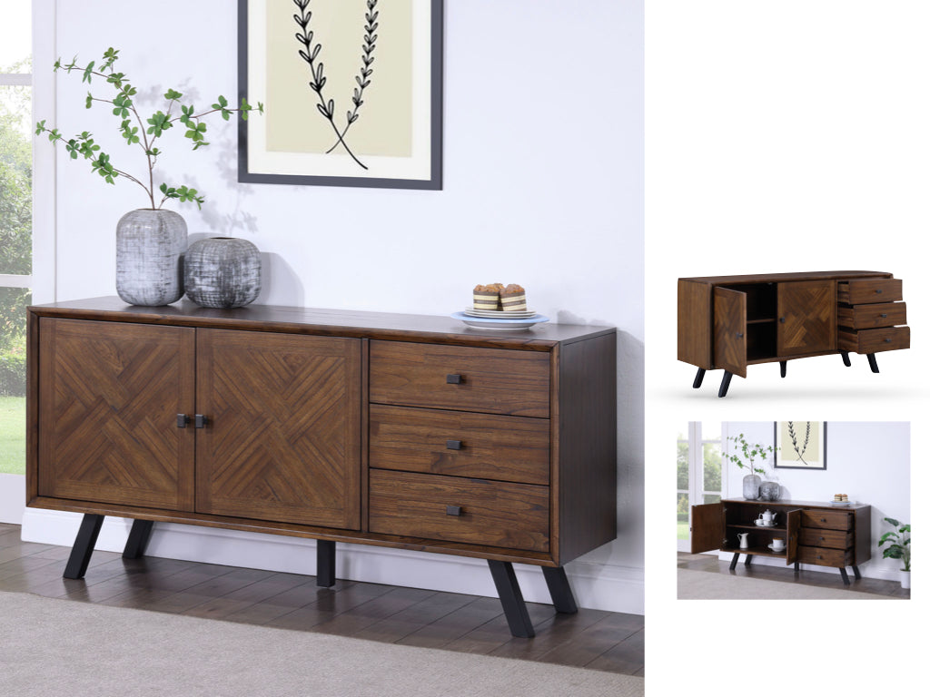 This sideboard’s sturdy construction ensures long-lasting durability, while the intricate parquet pattern and sleek handles offer a sophisticated aesthetic. Ideal for organizing your space, the Nevada Triple Sideboard is a practical and stylish addition to your home.