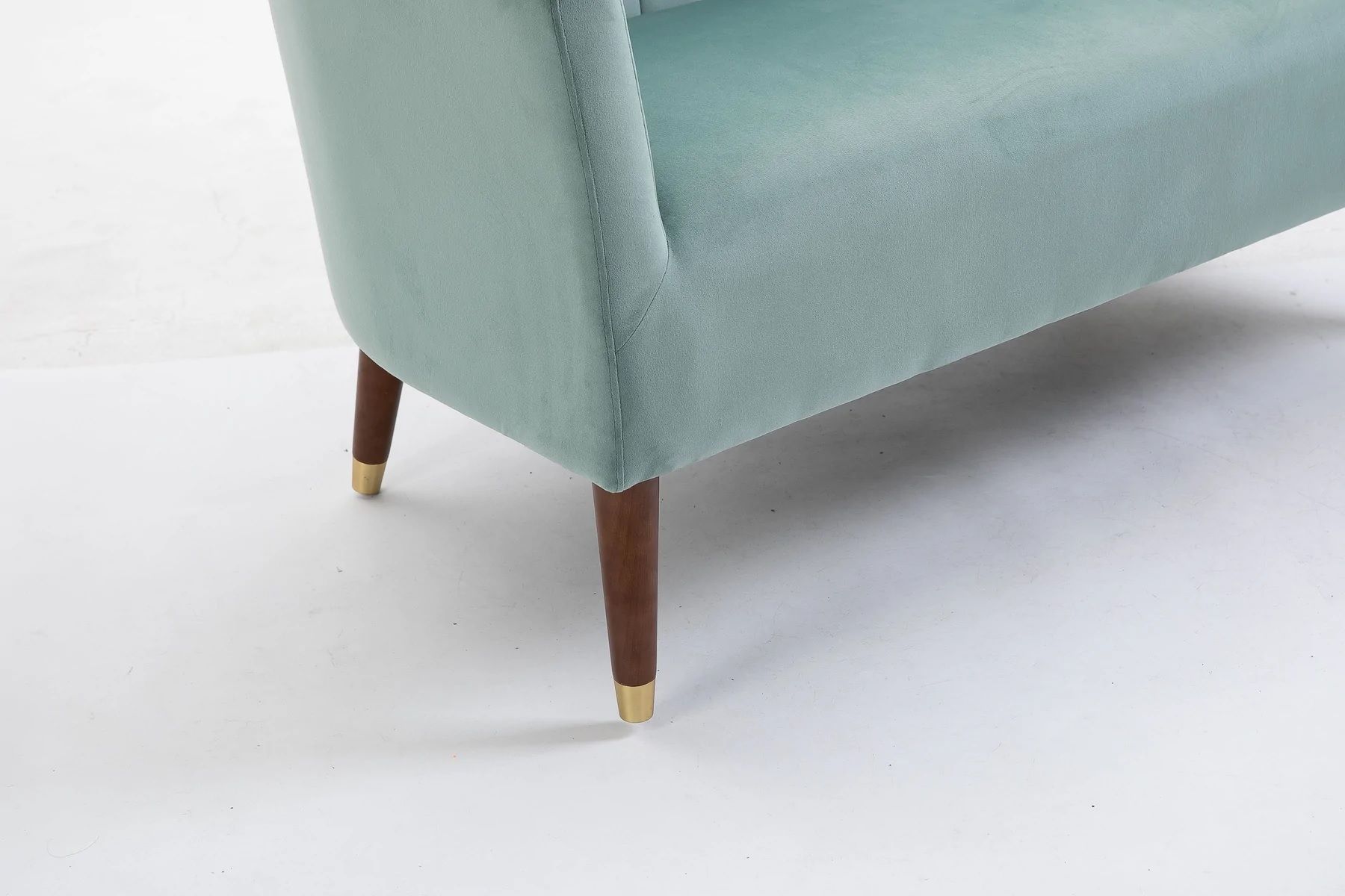 Enhance your living space with the Nicole Velvet 2 Seater Sofa in Teal. Features luxurious teal velvet fabric, solid wood legs with dark oak finish, and brushed gold ferrule feet. Perfect for adding a touch of elegance and comfort to any room.