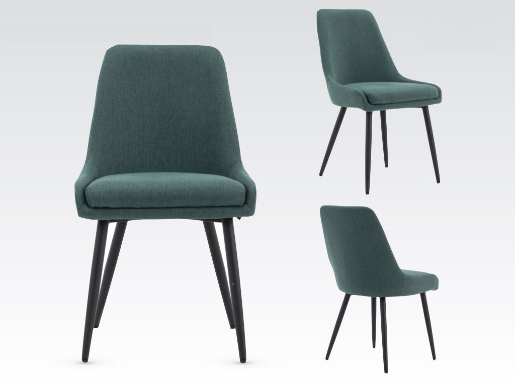 The Noah Dining Chairs, now available in a trendy dark green fabric finish. These chairs showcase a contemporary sand-blasted effect
