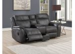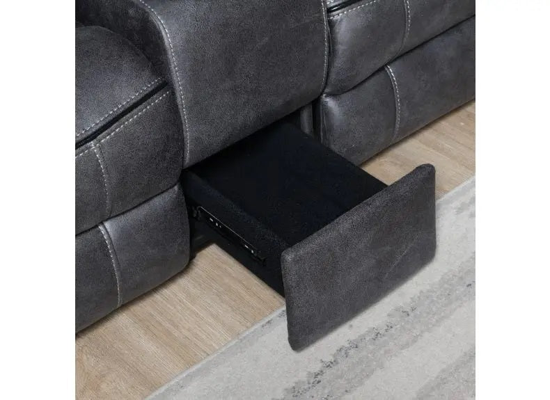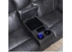 - Two-seat sofa with console includes hot/cool powered cup holders, a lidded storage box, slide-out drawer, and wireless charging point for added convenience.