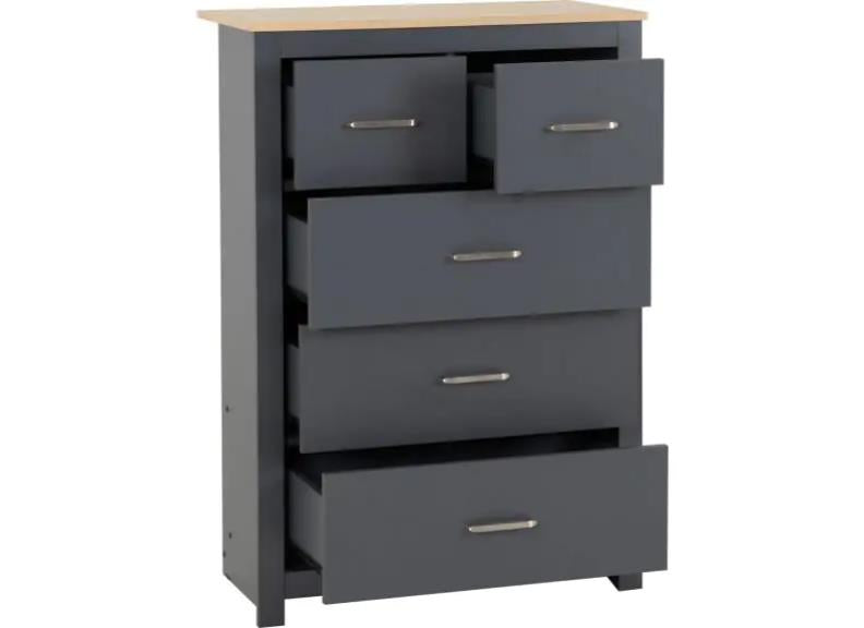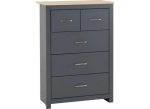 PORTLAND 2+3 DRAWER BEDROOM CHEST OF DRAWERS – All Portland items are crafted chiefly from dark grey lacquered wood board with oak effect tops & MDF wood with metal handles, drawer runners & hinges.