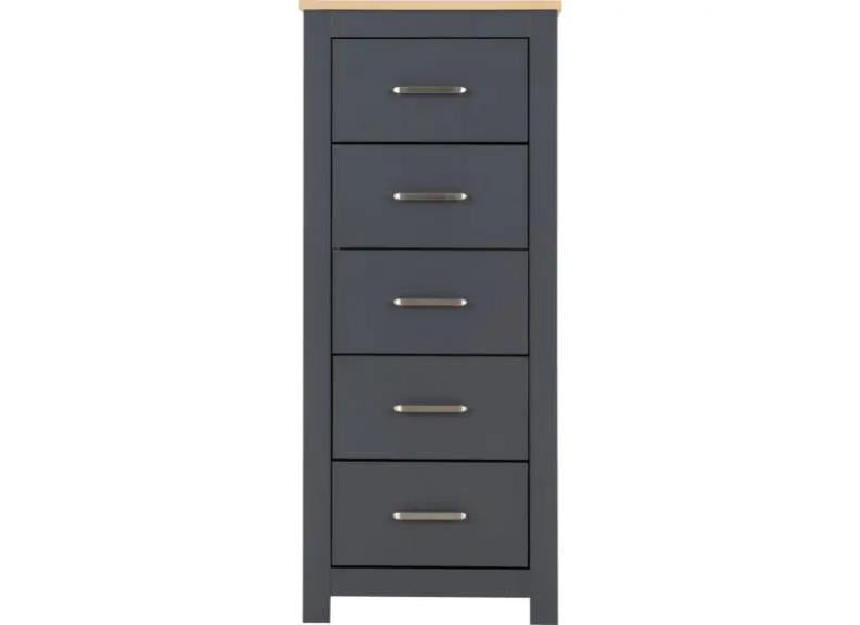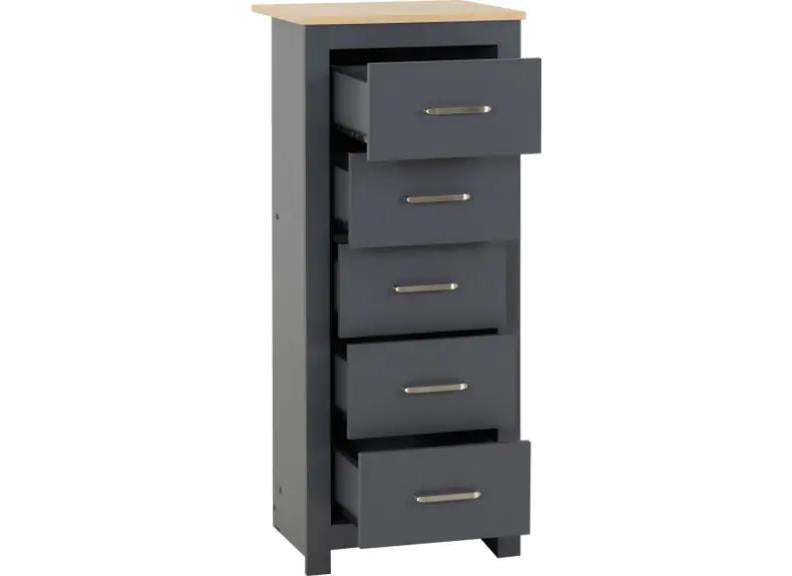 PORTLAND FIVE DRAWER TALL BEDROOM CHEST OF DRAWERS – All Portland items are crafted chiefly from dark grey lacquered wood board with oak effect tops & MDF wood with metal handles, drawer runners & hinges.