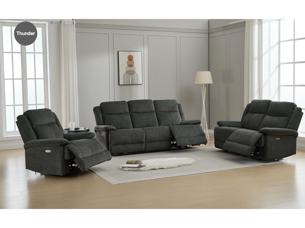 Introducing our Electric Reclining Suite, available in luxurious Dusk, Storm, and Thunder soft-touch fabric options. This suite offers the ultimate in relaxation and convenience. With pocket-sprung seats for superior support and comfort, Rockport is designed for long-lasting durability and a plush seating experience. The high headrest provides excellent neck and head support, perfect for unwinding after a long day. Effortlessly adjust to your ideal position with the electric reclining function, while the built-in USB port ensures your devices stay charged and within reach. Elevate your living space with the perfect blend of modern convenience and luxurious comfort.