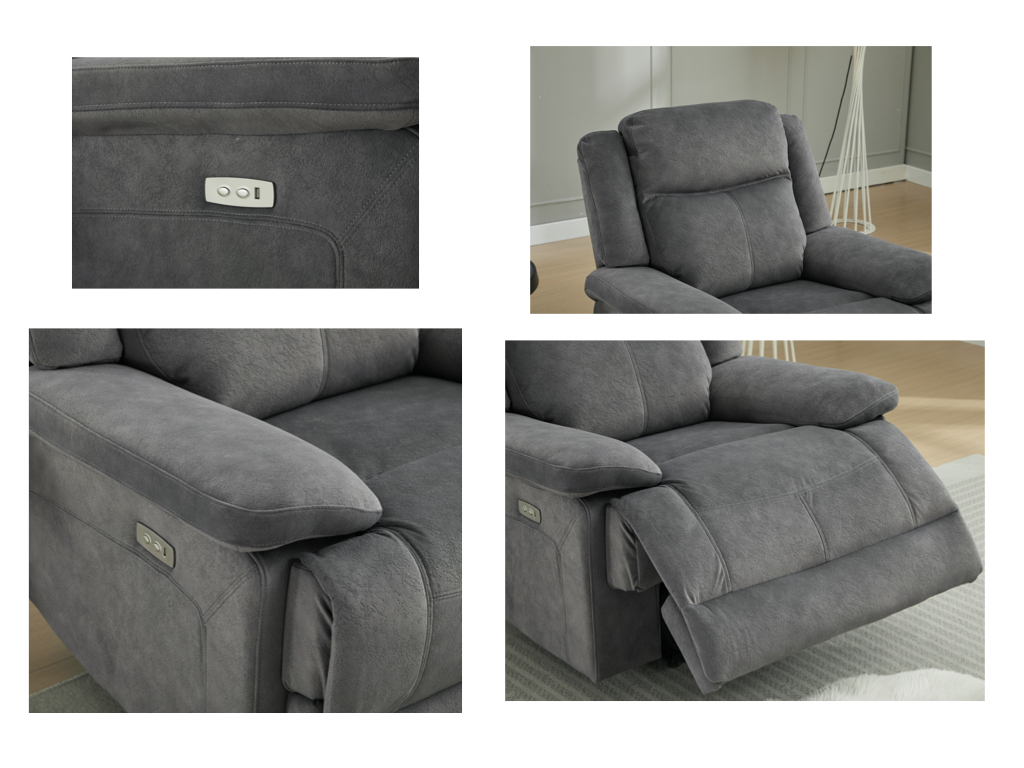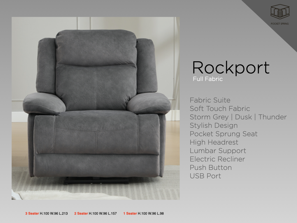 Introducing our Electric Reclining Suite, available in luxurious Dusk, Storm, and Thunder soft-touch fabric options. This suite offers the ultimate in relaxation and convenience. With pocket-sprung seats for superior support and comfort, Rockport is designed for long-lasting durability and a plush seating experience. The high headrest provides excellent neck and head support, perfect for unwinding after a long day. Effortlessly adjust to your ideal position with the electric reclining function, while the built-in USB port ensures your devices stay charged and within reach. Elevate your living space with the perfect blend of modern convenience and luxurious comfort.