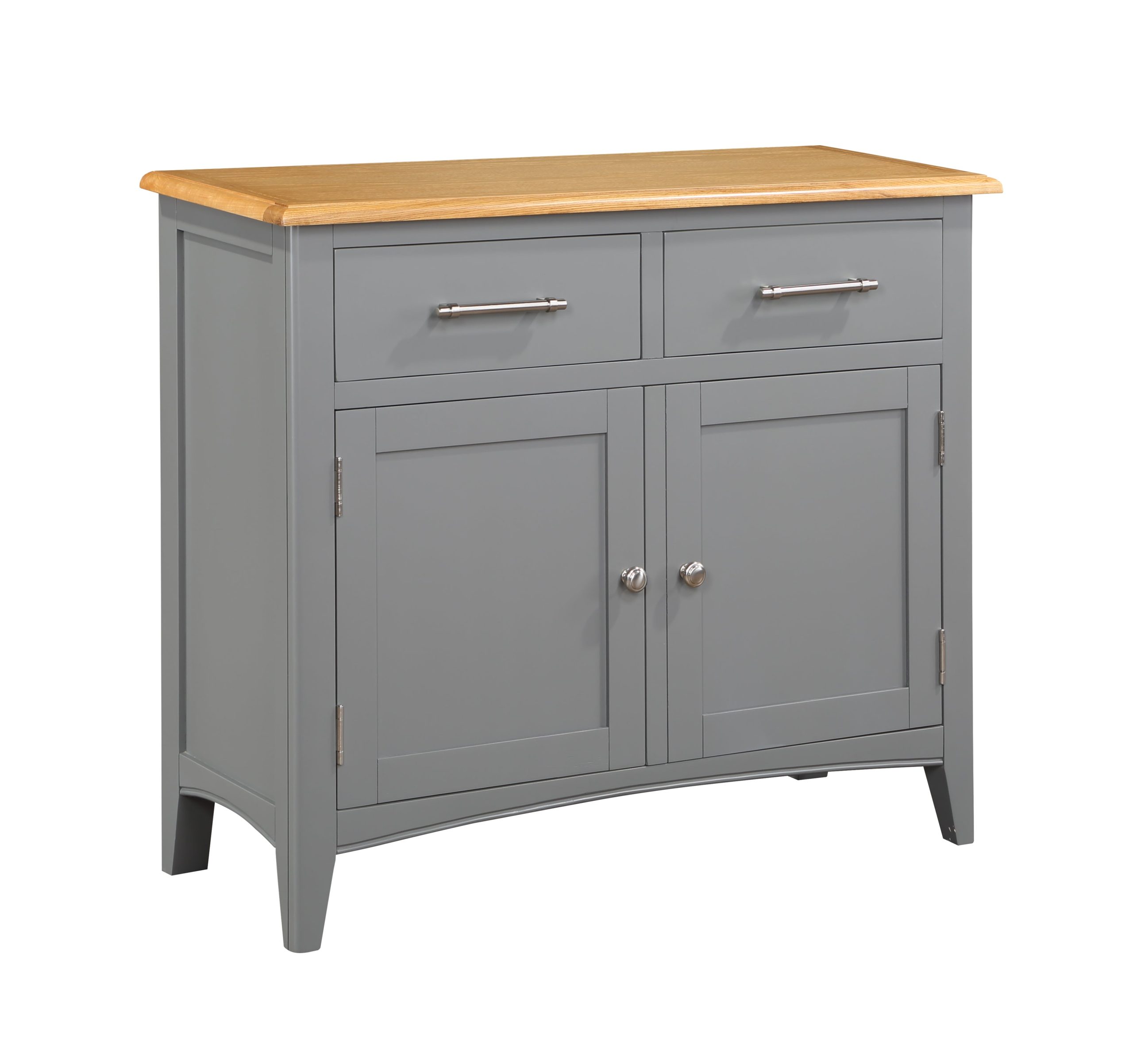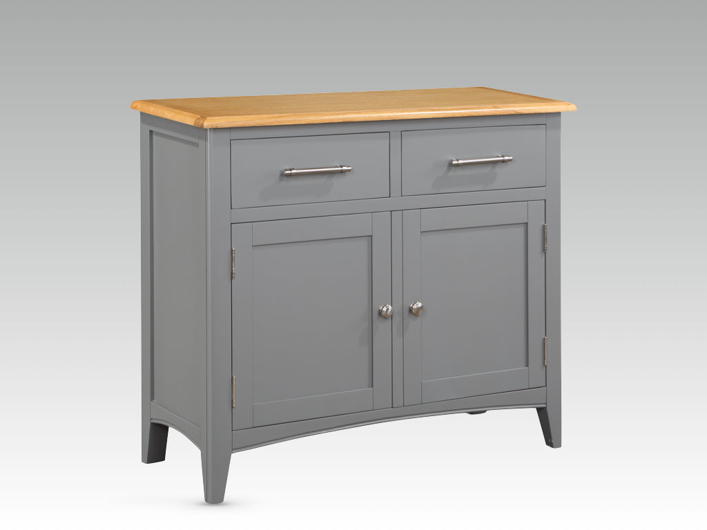 Introducing the Rossmore Painted 2 Door Sideboard – contemporary yet functional. Made with solid oak and oak veneer, featuring a modern slate grey finish. Ample storage with 2 doors, internal shelving, and elegant chrome handles. The mid-oak top offers a beautiful contrast. A stylish focal point for your living or dining area.